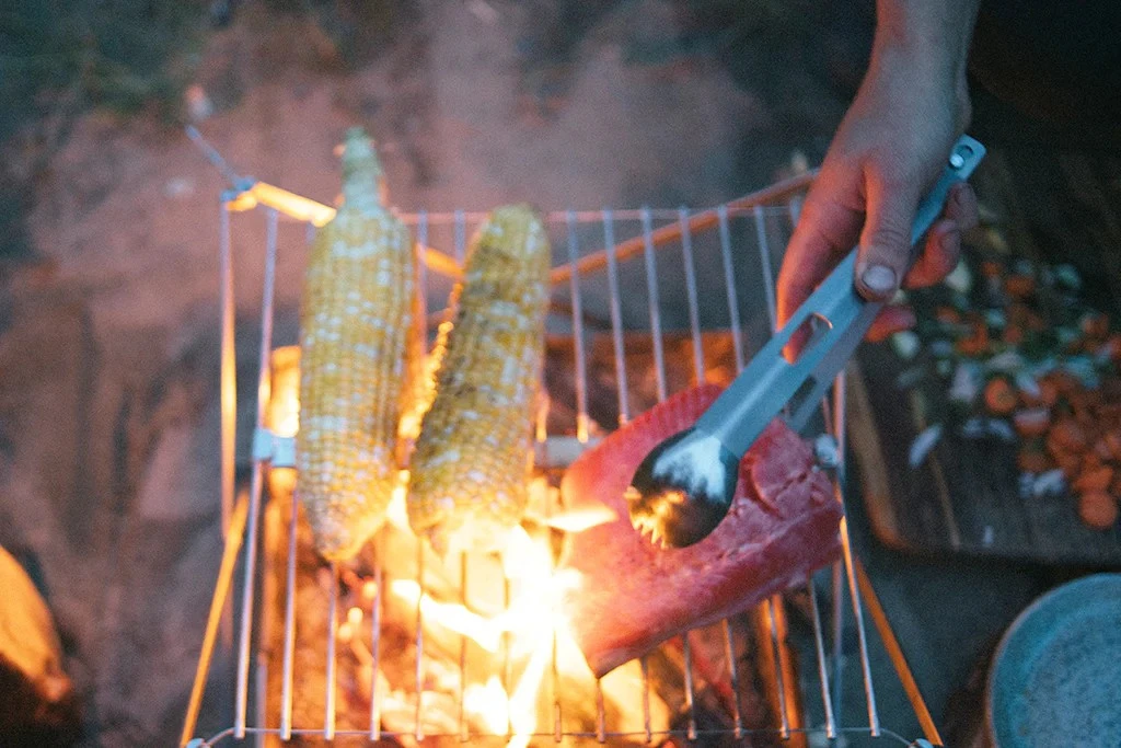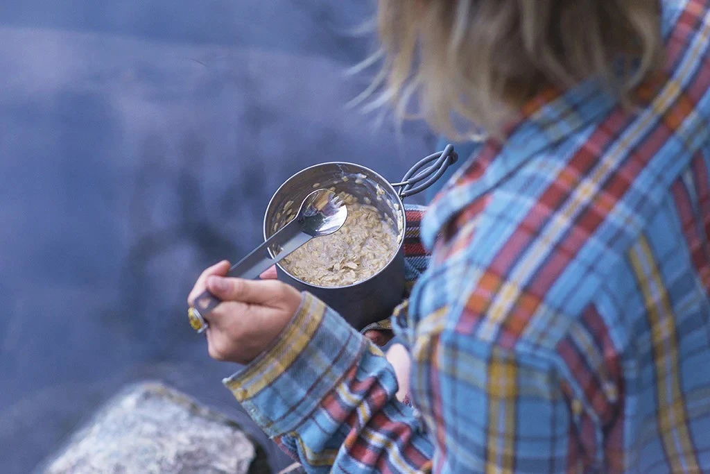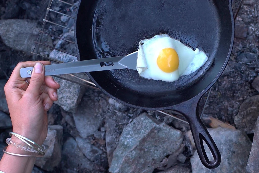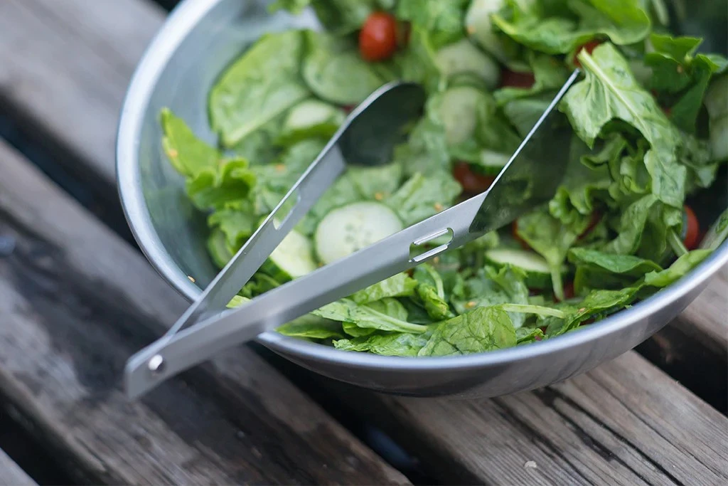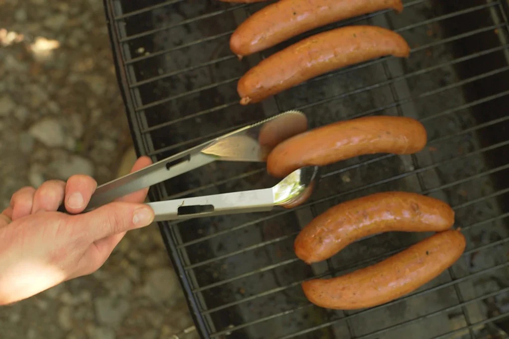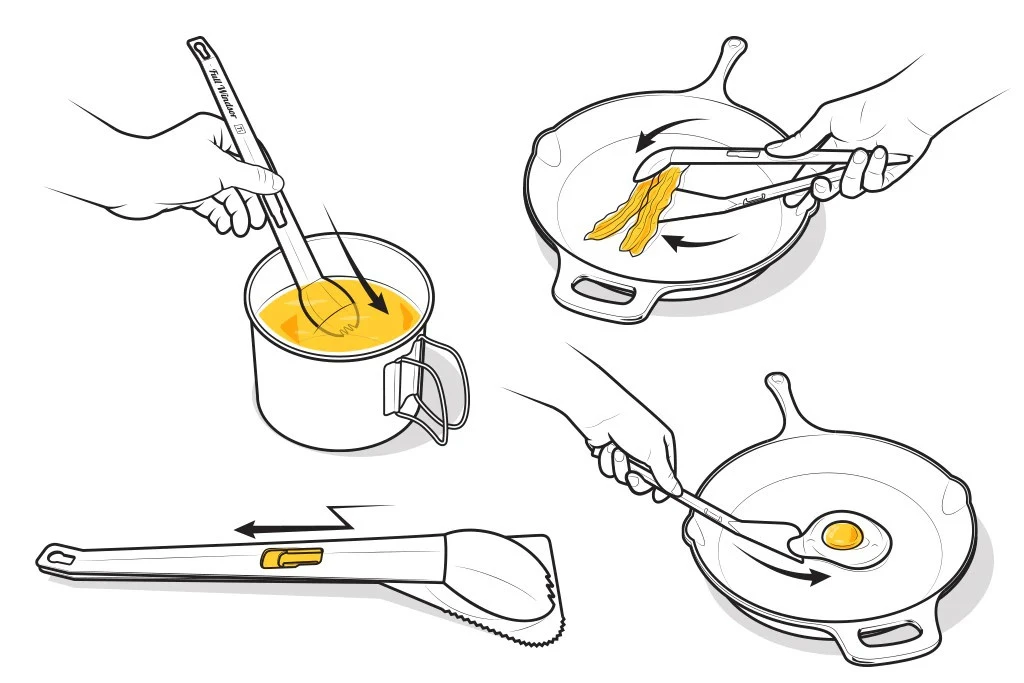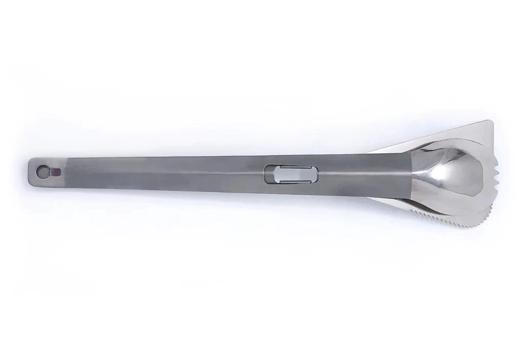 La cuillère et la spatule peuvent se regrouper pour former une pince. Une goupille en acier inoxydable sur le haut de la spatule et un trou dans la cuillère permettent de former cette pince très rapidement. Le titane est naturellement flexible, la pince a donc une force de préhension parfaite. Pratique pour retourner les aliments sur le barbecue, préparer des bons petits plats au camping et les déguster ensuite.