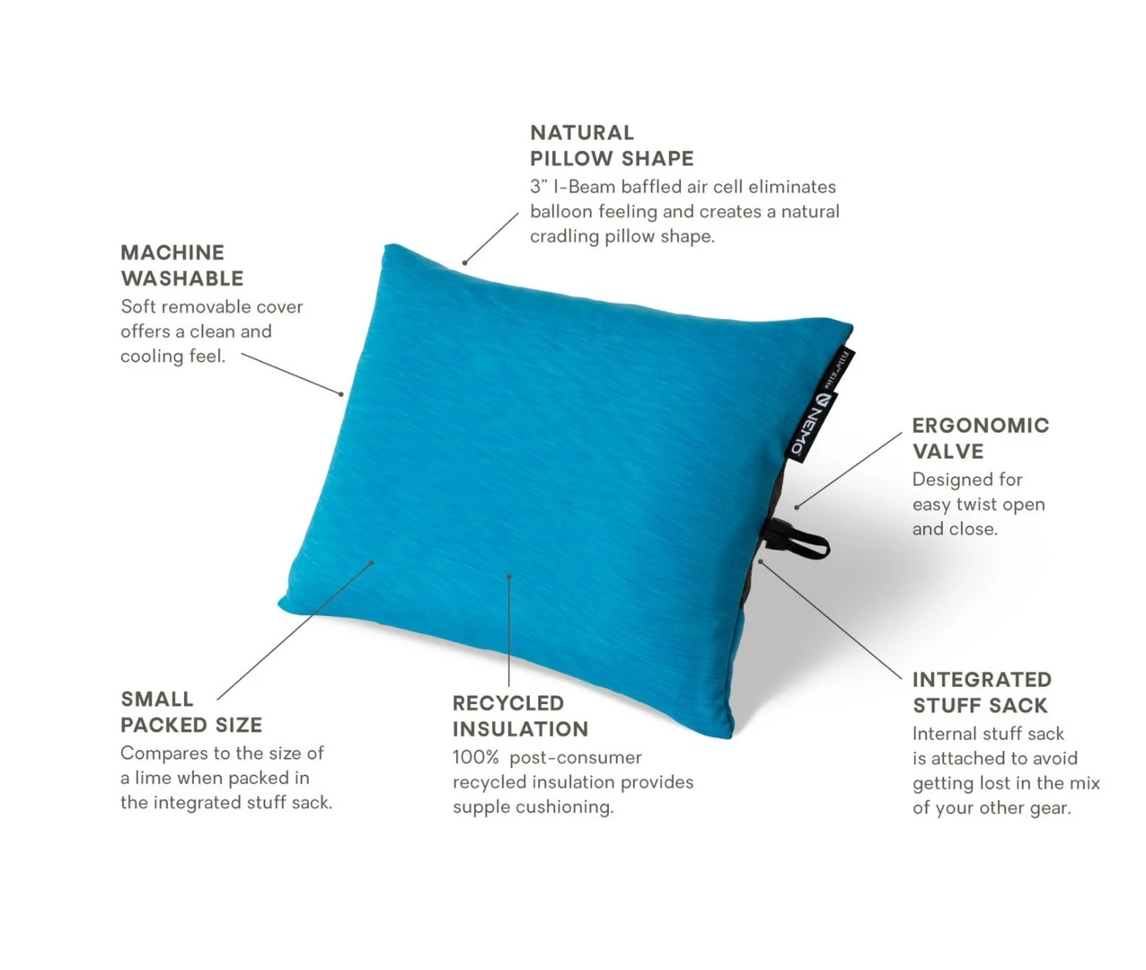 Sa housse de rangement est directement intĂ©grĂ©e dans le coussin, ce qui permet un gain de place, de poids et facilite son utilisation. La valve de gonflage est ergonomique pour gonfler plus facilement l’oreiller.