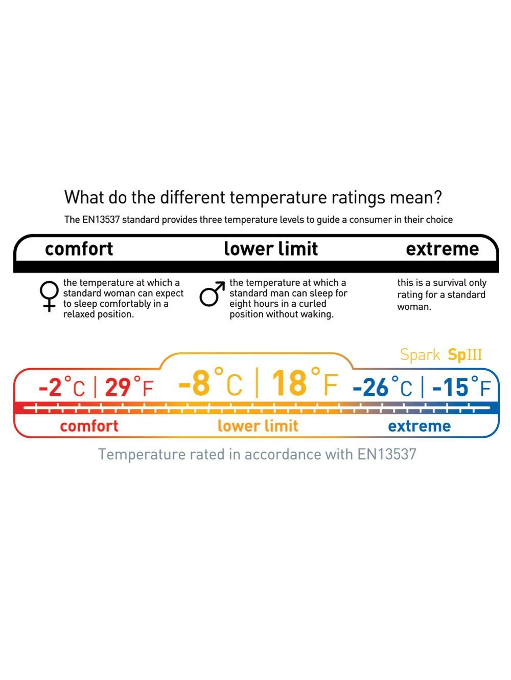 Confort : le Spark 3 est garni de 430 g (taille Regular) de duvet d’oie européen 850 cuin, répartition 90/10, ce qui correspond à une température confort de -2°C (selon la norme européenne EN13537). L’enveloppe intérieure et extérieure est en nylon léger 7 deniers, agréable au touché.